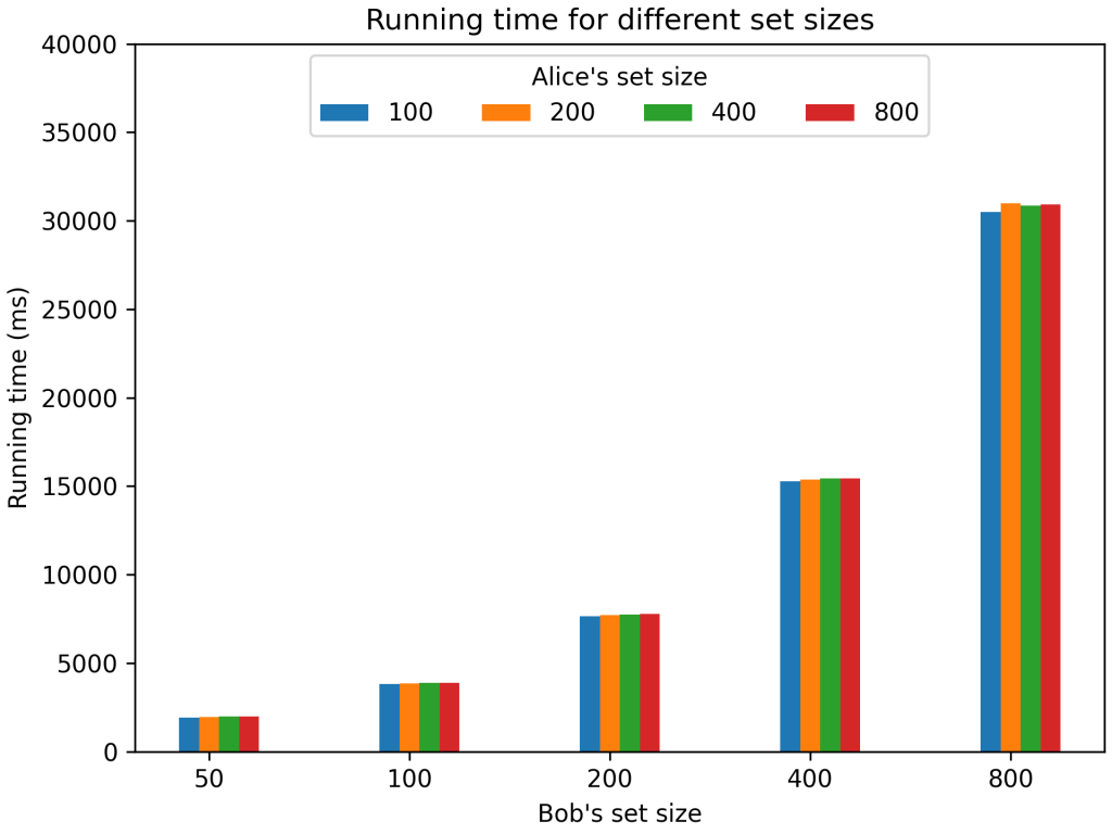 Finally, we run the same experiments with different sizes for Alice’s set. It turns out that because of the way Microsoft SEAL is implemented in an array-first way, increasing the size of the Alice set (up to an upper-bound) does not increase the execution time. You can see this in the following benchmarks chart, where running time only changes when Bob’s set size does: